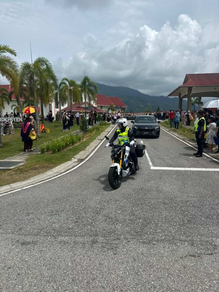 The UPSI Security Division escort team plays a vital role in ensuring smooth traffic flow and the safety of the movements of distinguished guests throughout the convocation ceremony.